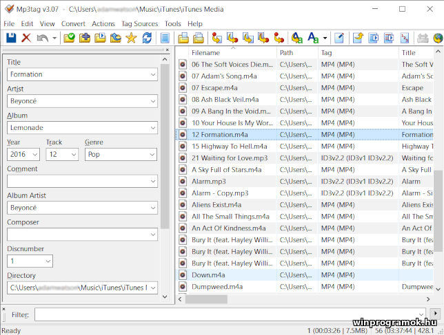 | Tag típusok | ID3v1, ID3v2.3, ID3v2.4, iTunes MP4, Vorbis Comments, APE Tags |