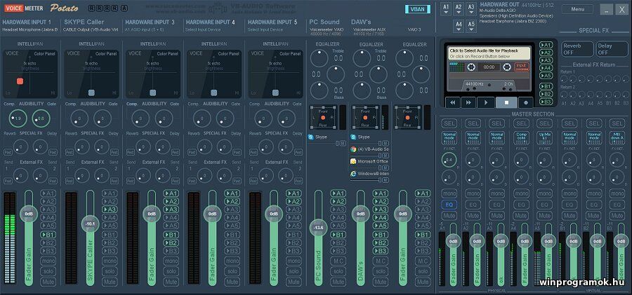 - Keverés és szétválasztás: Keverje össze hangját a háttérzenével vagy filmhanggal, és küldje tovább egyetlen virtuális bemenetként Skype-ra vagy Zoomra.